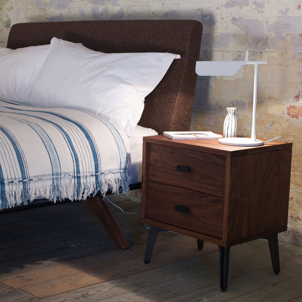 McQueen Bedside Chest is strong, elegant and down-to-earth, its two drawers provide the ideal space for objects needed close to the bed. Drawers are detailed with dovetail joinery, cast iron handles, and soft-closing piston action.