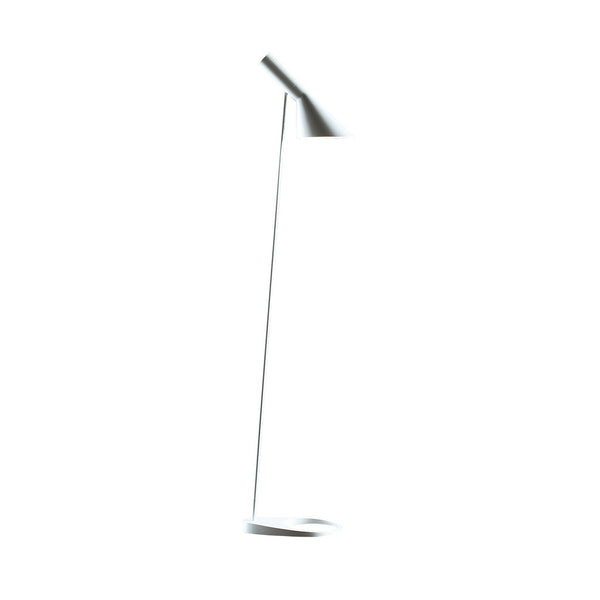 Designed by Arne Jacobsen in 1960. The AJ Floor is a design classic - iconic for its simple yet elegant design. The head has a distinct, asymmetrical shape, which determines the light characteristics of the fixture. It emits downward directed light. The angle of the shade and rotation can be adjusted to optimize light distribution. The shade is painted white on the inside to ensure a soft comfortable light. Switch on lamp stand.