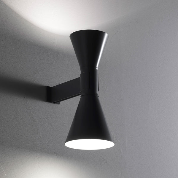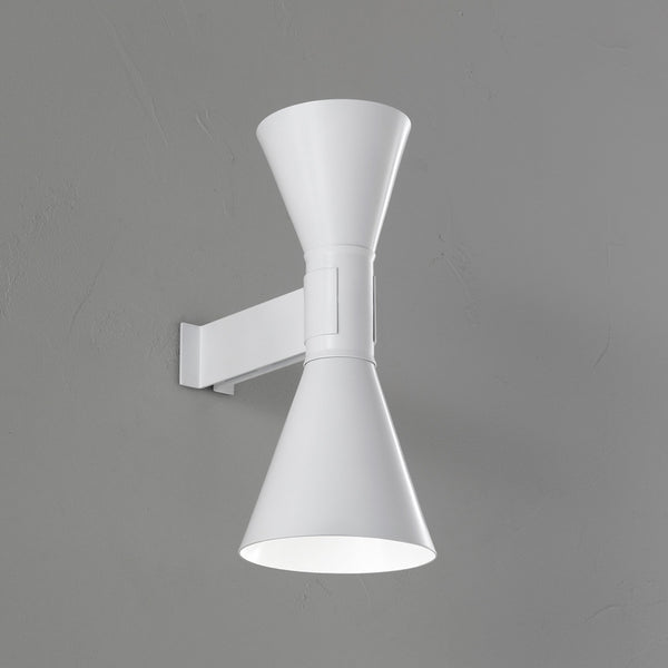 Wall light with a lamp on both the top and bottom. Each can be lit independently or together. A light that combines form and function.
