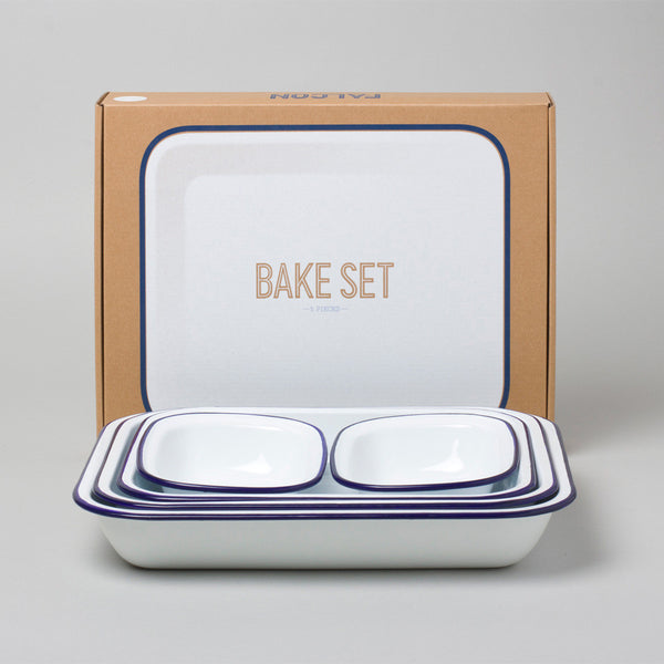 Falcon enamelware has been an icon of British home life since the 1920's. Ice white with a distinctive blue rim it is instantly recognisable as a design classic. This set includes five piece.