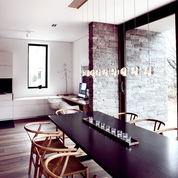 The 14 is an articulated, seamed cast glass sphere with a frosted cylindrical void that houses either a low voltage (12V, 10W halogen/xenon) or LED(12V, 0.3W) lamp. Individual pendants are visually quite subtle, but gain tremendous strength when multiplied and clustered in large groups. Light interacts with the bubbles and imperfections of the cast glass to produce a glow reminiscent of small candles floating within spheres of water. Cast glass is an organic process, imperfect by nature and each 14 is hand made; thus, every piece produced is unique.