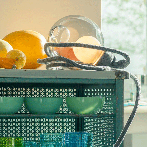 The 28d fixture is designed to sit on a horizontal surface (a desk, table, shelf, or even the floor). It consists of a single illuminated 28 piece wired to a flexible grey crochet memory cable. The cable is intended to be coiled into a sculptural pattern to provide a cushioned surface on which the glass sits.