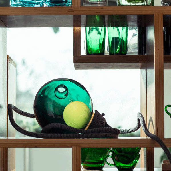 This low voltage fixture results from a complex glass blowing technique, which creates a unique spherical shape with a composed collection of inner “satellites”, one of which is an opaque milk white glass bubble that houses a 20 watt xenon lamp.