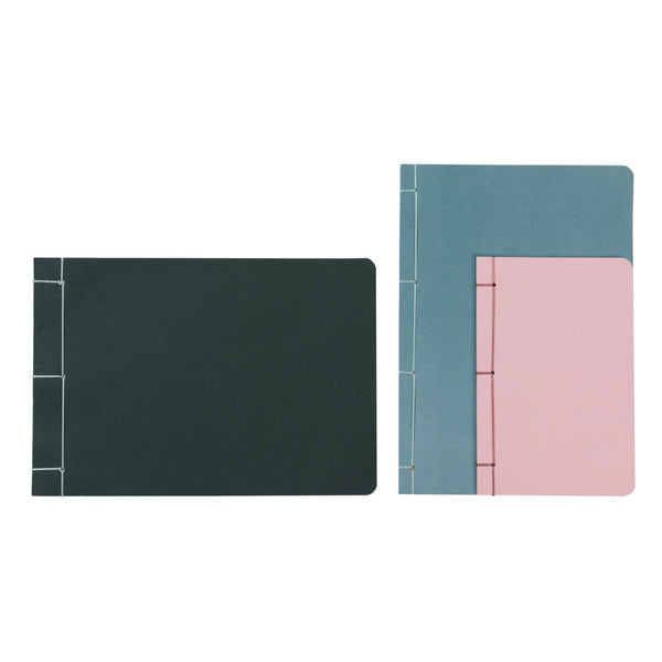 Notebooks with thin coloured cover sewn together with polyester thread.