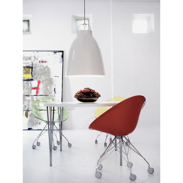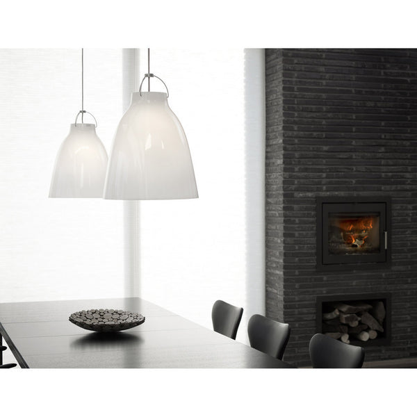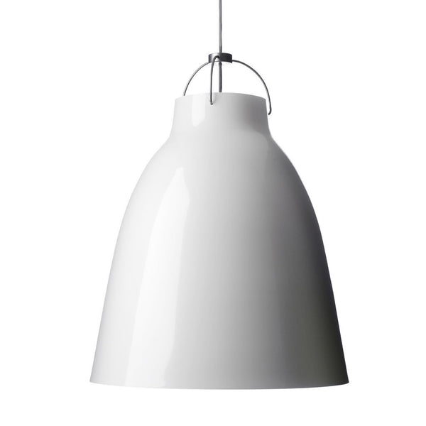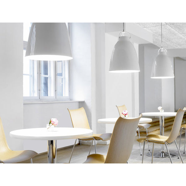 The shade is made of drawn steel and coated with smooth, high-gloss paint. The suspension assembly consists of curved steel rods and two pieces of die-cast, aluminium-zinc alloy coated in matt chrome. The depth of the shade prevents glare, no matter how high the pendant is hung. Caravaggio also features an opening at the top, which casts light upwards and illuminates both the suspension and cord.