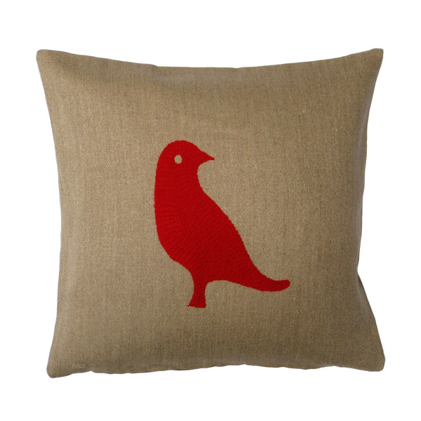 Dove is a hand-embroidered cushion using red wool tapestry yarn on 100% natural beige linen. It's simple beauty is elegant and pleasing. Removable feather interior.