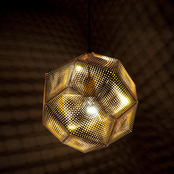 An acid etched pendant light inspired by the logic of pure mathematics. Etch Light is made up of 0.4mm digitally etched brass sheets. The detailed pattern creates a mass of intricate shadows when lit. This is the assembled version.
