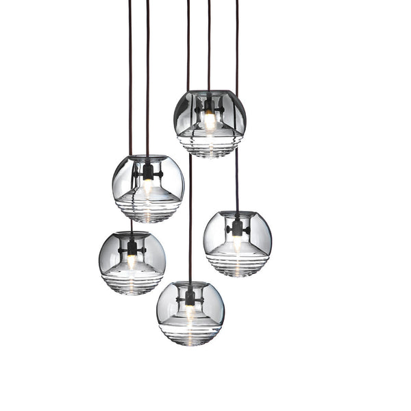 Like a mysterious chemistry experiment, Flask is a spherical object made up of two, hand- blown, glass components; flask and hood. The ridged and rounded Flask base refracts the light giving a warm, rippled and comforting glow, while the smoked-glass hood covers the lamp fitting reducing glare.