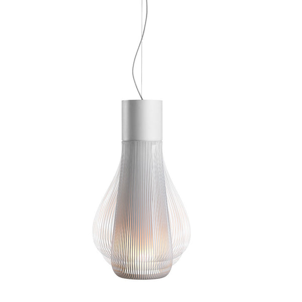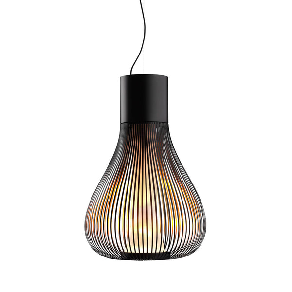 Suspension lamp providing diffused lighting. In this version the light emission can be adjusted by means of a mechanical movement that opens the louvers, thereby varying the shape of the luminaire.Available in black or white.