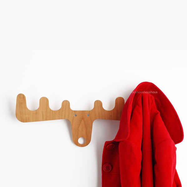 A fun coat rack for hanging up coats, umbrellas and scarves. Mounting rail rail made from machined beech with plywood faced antlers.