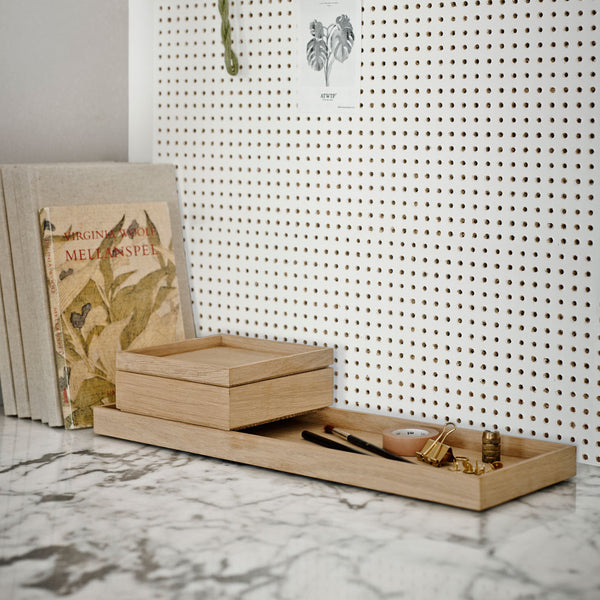 A beautifully crafted wooden oak tray perfect for storing small things. The tray can be combined with the Nomad box providing a neat storage system for the desk or bathroom.