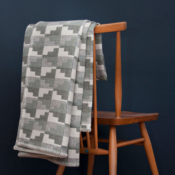 Eleanor Pritchard's collection of blankets use bold geometrics with a strong graphic feel. The palette includes a number of solid and cross-hatched neutrals with sharp accents. Northerly references weather maps with its cool sage green grey tones. The aesthetic is fresh and contemporary with a nod to English midcentury design.