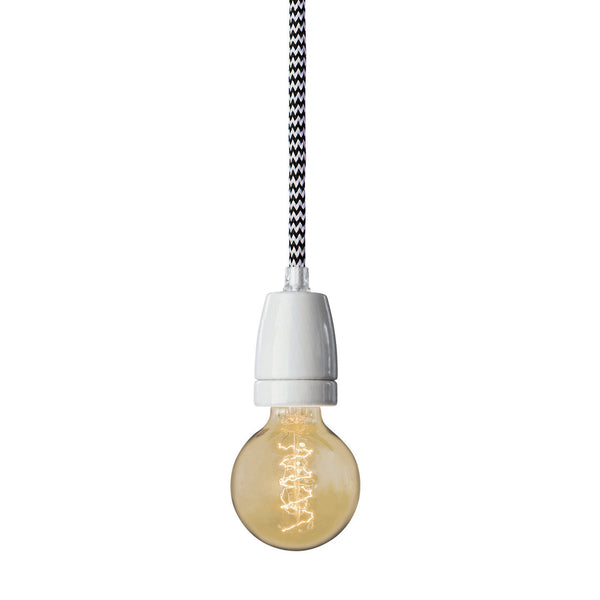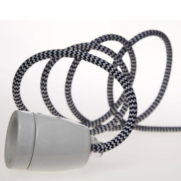 White porcelain socket with textile cable, ceiling cap in white plastic. Approved for use in all the UK and Europe.