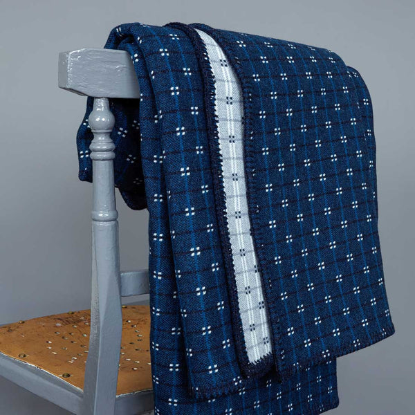 Peppercorn is woven in a soft lambswool yarn. This delicate four dot reversible design has a deep petrol colour on one face and a pale blue-grey colour on the other. Blanket stitch edging in dark navy.