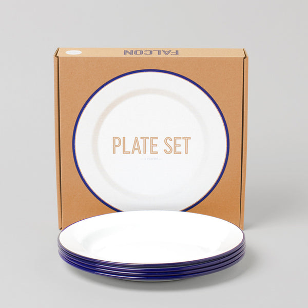 New from Falcon Enamelware. A set of four enamel plates with coloured rims. Perfect for picnics or barbeque. Available in original blue or pillarbox red rim.
