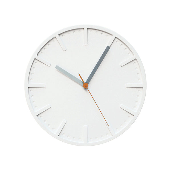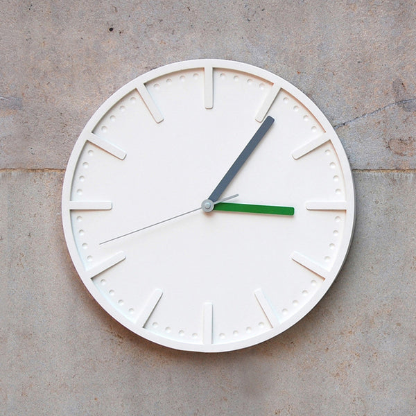 The substantially proportioned Polymer clock is made from plaster polymer using a casting process to produce the clock face with raised and embossed digits. The hand casting technique means that no two clocks are exactly the same. The clock is available in three different colour ways - green/grey, orange/grey or blue/grey.
