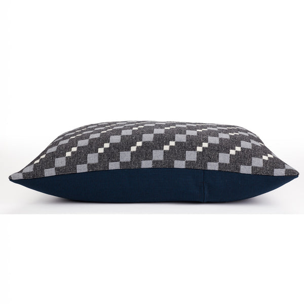Named after the liquorice cakes from the Yorkshire town of Pontefract this design has a graphic quality with a strong diagonal pattern running over a cross-hatched ground. Woven in a soft lambswool yarn the cushion is made up of a charcoal fleck with blue-grey and white.