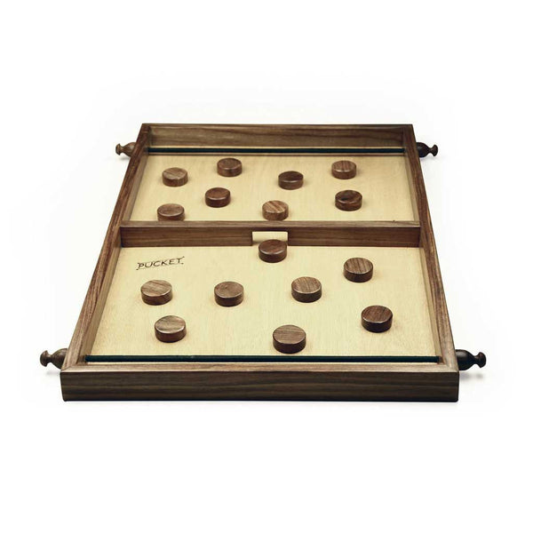 Based on a traditional French game known as Table a l'elastique. Players race each other to clear the discs ("pucks") from their side of the board by catapulting them through a small hole leading to the other side (the "gate"). Any pucks that arrive on your side must be sent back before you can win. Great fun.