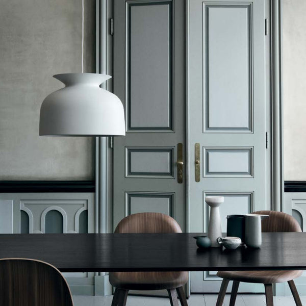 The Ronde Pendant comes in two sizes and is available in five colours: Matt white, Rusty Red, Pigeon Grey, Anthracite and Charcoal Black.