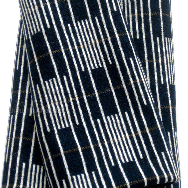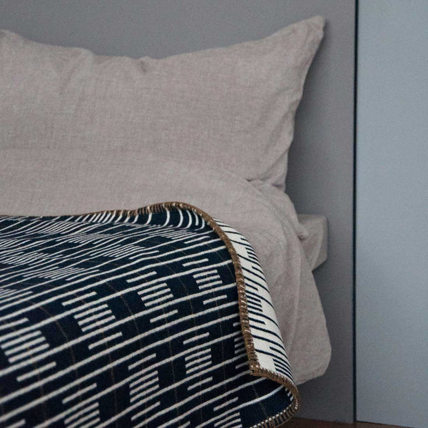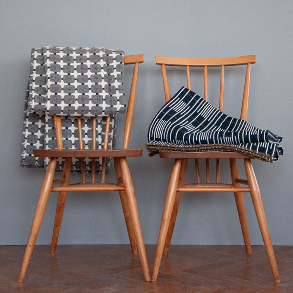 Eleanor Pritchard's collection of blankets have a bold geometric design with a strong graphic feel. The palette includes a number of solid and cross-hatched neutrals with sharp accents and the aesthetic is fresh and contemporary with a nod to English midcentury design. Signal references sound waves and radio transmissions - it has a reversible design.