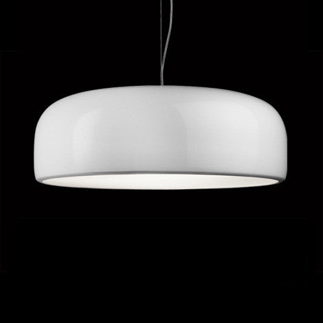 Suspension lamp with direct light. Aluminium body. Injection-moulded opalescent polycarbonate diffuser. Steel ceiling attachment with steel suspension cable.