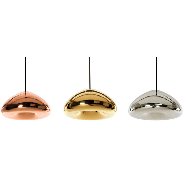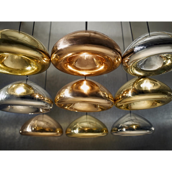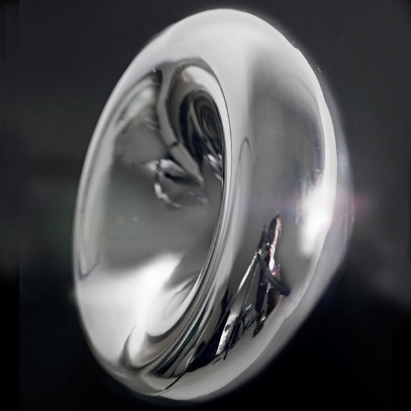 Sheet metal is pressed, spun and brazed to form a double wall shade. The double walls reflect and soften the light emitted from a concealed halogen bulb. This mysterious lighting object is hand polished to create a mirrored surface which is then lacquered to maintain a high gloss finish.