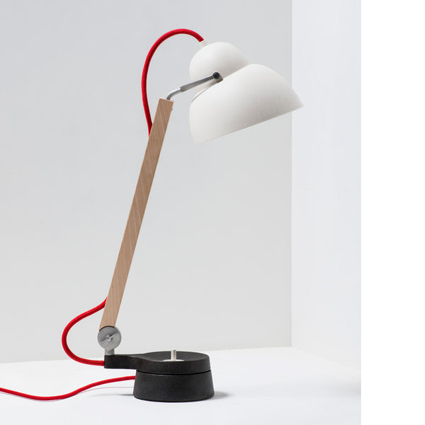 Dimmable table lamp. Slightly transparent shade hides light source for glare protection. One joint, an adjustable head and a rotation mechanism in the base. Electronic components integrated.